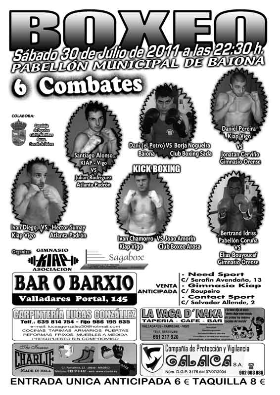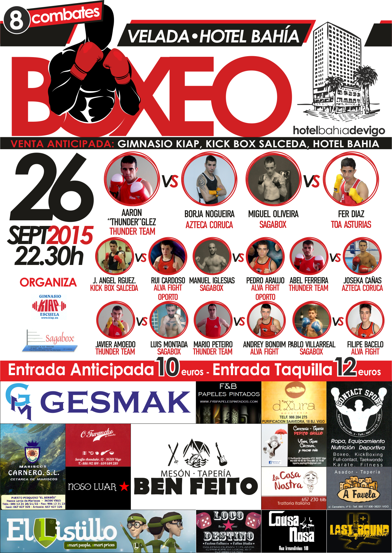 El Club Sagabox y el Gimnasio Kiap de Vigo, les informan, que este sabado dia 26 de septiembre, a las 22:30 horas, en el Hotel Bahia, procederemos a realizar la sexta velada este año de boxeo, siendo la cuarta en el Hotel Bahia. Se realizarán ocho combates, todos ellos a la distancia de tres asaltos de tres minutos. Los clubes participantes son: Alva Figth de Oporto, Gimnasio Toa de Avilés (Asturias), Azteca (Coruña), Thunder Team (Marin), Kick Box Salceda y el Club Sagabox de Vigo. Los combates son: peso welter 1º FILIPE BACELO VS PABLO VILLARREAL ALVA FIGTH SAGABOX peso welter 2º ANDREY BONDIM VS MARIO PETEIRO ALVA FIGTH THUNDER TEAM peso medio 3º LUIS “SIUL” MONTADA VS JAVIER AMOEDO SAGABOX THUNDER TEAM peso ligero 4º JOSEKA CAÑAS VS ABEL FERREIRA AZTECA THUNDER TEAM peso welter 5º PEDRO ARAUJO VS MANUEL IGLESIAS ALVA FIGTH SAGABOX peso pesado 6º RUI CARDOSO VS JOSE ANGEL RODRIGUEZ ALVA FIGTH KICK BOX SALCEDA peso gallo 7º FERNANDO DIAZ VS MIGUEL “MICHU” OLIVEIRA TOA AVILES SAGABOX peso welter 8º BORJA NOGUEIRA VS AARON “THUNDER” GONZALEZ AZTECA THUNDER TEAM