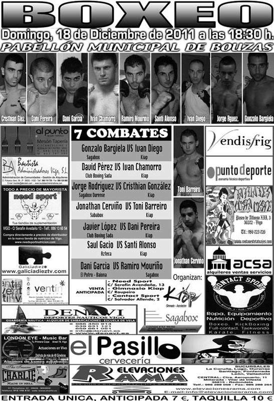 Se realizaran ocho combates destacando un combate femenino, la presencia del campeon gallego Borja Martinez Nogueira y el combate de fondo la gran revancha entre Dani "El Potro" Garcia y el rocoso Ramiro Mouriño, combate que seguro que hara las delicias de los aficionados.