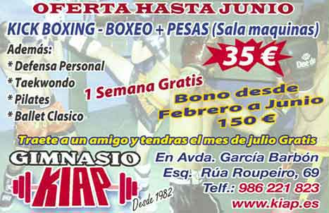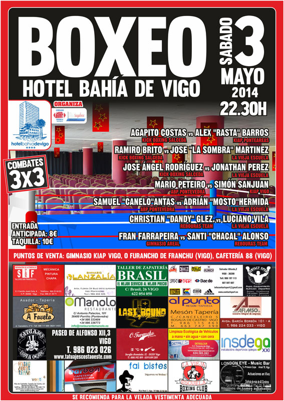 El gimnasio Kiap de Vigo y el Club Deportivo Sagabox, tienen el placer de comunicarles, que realizaremos una gran velada de boxeo, en el emblemático Hotel Bahia de Vigo, el cual nos cede sus instalaciones para tal evento, diremos que es una apuesta, en la que aparte de lo deportivo, cuyo éxito esta asegurado, se busca realizarlo en otros marcos distintos al que estamos acostumbrados. Dicha velada constará de sietes combates, todos ellos dentro del campo de Boxeo Olímpico, a tres asaltos de tres minutos; la velada comenzará a las 22:30 horas, en la primera planta del hotel, las entradas están ya a la venta, entrada única anticipada a ocho euros y los puntos de venta son: Gimnasio Kiap ( Garcia Barbon-Roupeiro), Cafeteria 88 (Tomas A. Alonso, 88) y O Furancho de Franchu (Serafín Avendaño). todos ellos de Vigo. En taquilla el dia de la velada el coste de la entrada será de diez euros