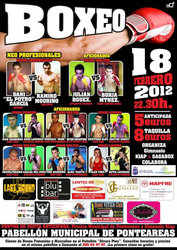 Celebraremos la velada de Boxeo el proximo sabado dia 18 de febrero en el Pabellon Alvaro Pino, en la localidad de Ponteareas, la hora de comienzo sera a las 22:30 horas.